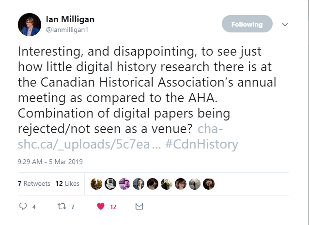 Traditionally, ASEH does not have a strong digital showing. This year, a search for “digital” turns up a single paper (which mentions media as part of a broader argument about the historical roots of youth activism on the issue of climate change). ASEH is not alone in this regard – here in Canada, the Canadian Historical Association (CHA) has at least one panel devoted to digital engagement as well as a few papers with digital components (check out their program). But as Ian Milligan noted on twitter, the conference has traditionally not accepted and/or attracted much in the way of digital scholarship.