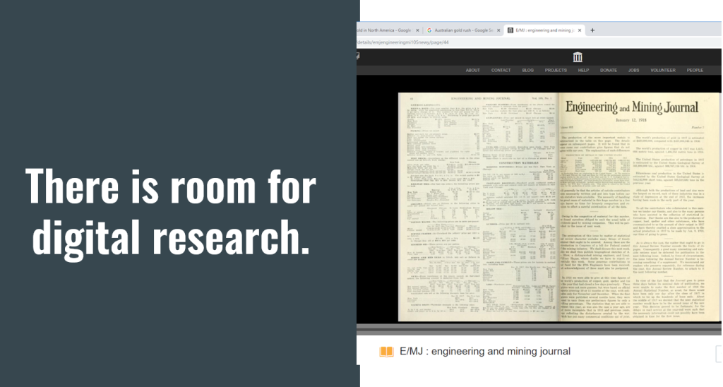 Mining data is structured data, and states have traditionally taken a good deal of care in recording mining activity. There are a plethora of digitized sources begging for analysis. See, for example, the Internet Archive’s collection of the Engineering and Mining Journal. State and provincial archives often have annual reports digitized on their websites, and most large mining companies kept structured annual reports. There is also a large body of scholarly articles dating back to the earliest days of geological research available, many of which are scanned and available through portals like Jstor. And, of course, there is a lot of digitized media available, from digitized newspapers to films and advertising.