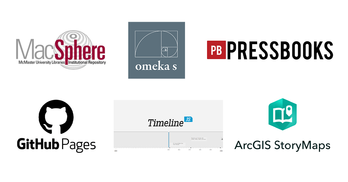 Thank you to our colleagues and collaborators for helping us assemble this guide! This list was co-written by Jay Brodeur (GitHub Pages), Myron Groover (Omeka S), Christine Homuth (StoryMaps), Joanne Kehoe (PressBooks), Veronica Litt (Timeline JS), and Gabriela Mircea (MacSphere).