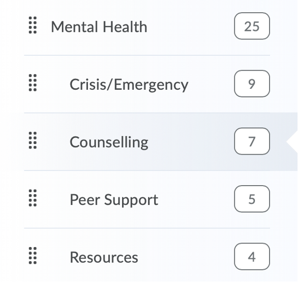 The side menu tab on the Avenue to Learn page has various topics that, when clicked on, expand to include sub-tabs. For example, under the “Mental Health” tab, there are sub-sections with resources for “crisis/emergency,” “counselling,” “peer support,” and “resources.”