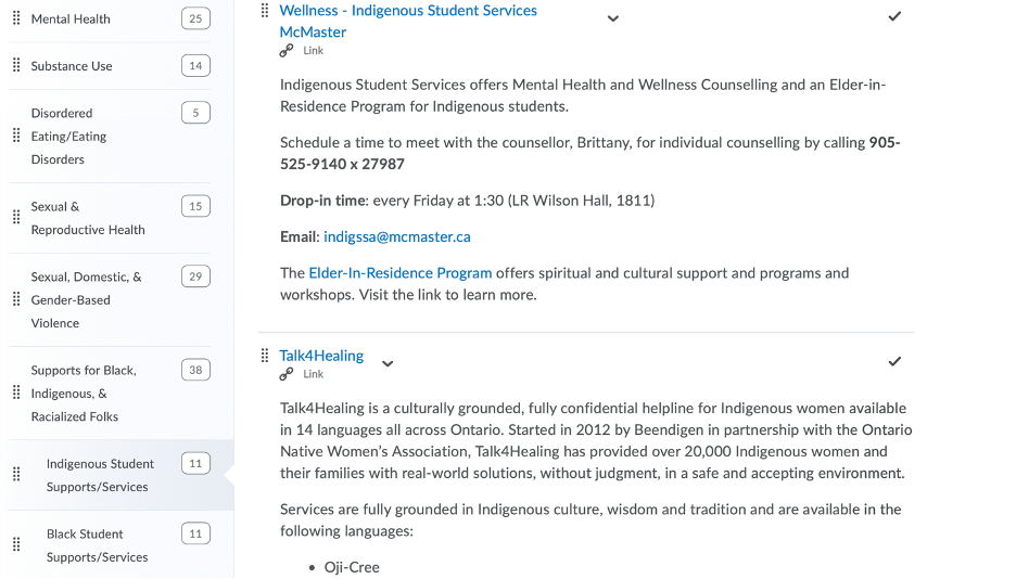 When you engage with each “sub-tab,” the links to each resource’s website expand to include text information about each service. For example, when you click on the “Indigenous Student Supports/Services” sub-tab underneath the main “Supports for Black, Indigenous, and Racialized Folks” tab, links and information about the service becomes available.