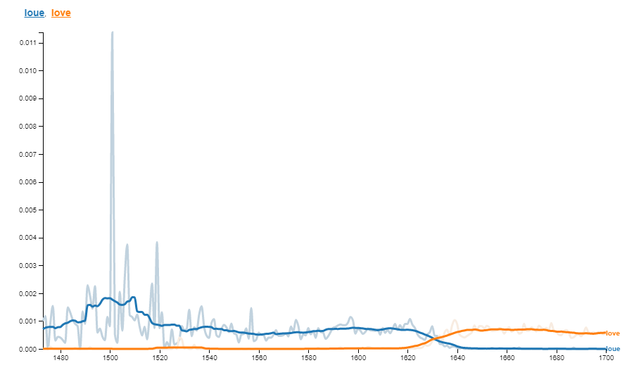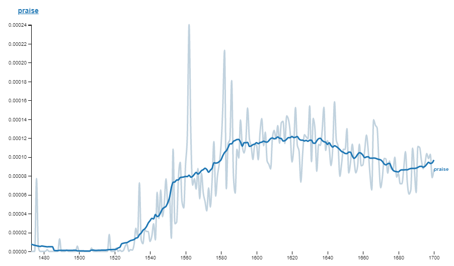 Thankfully, other scholars have begun to address these gaps. EarlyPrint.org provides Early Print Lab tools to help explore a number of interesting features in a selection of early modern texts. A sample graph from the N-Gram Browser shows how an earlier spelling of love with a u, loue, was superseded by the modern spelling of love with a v between 1620 and 1640. My own n-gram search of the word “praise” results in a graph that demonstrates it did become more popular in the seventeenth-century.