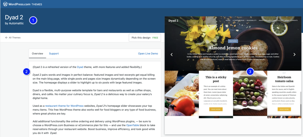 In response to the Dyad 2 template, I wrote: (1) This is the first option that caught my attention, probably because of the food vibes. (2) Wow–the phrase “words and images in perfect balance” is such a telling reflection on what food media should be: no text without its corresponding ‘featured’ image. I can’t really imagine a version of my own blog that would have so many images. (3) Multiple levels of discourse here. The second-person ‘you’ is placed right into the template, i.e. ‘you can do this or that…’. And then the lorem ipsum text takes over, to help readers imagine the full life of the blog. There’s also some imagined text of the finished/active blog itself, modelled by blurbs about cookies or tomato salsa.