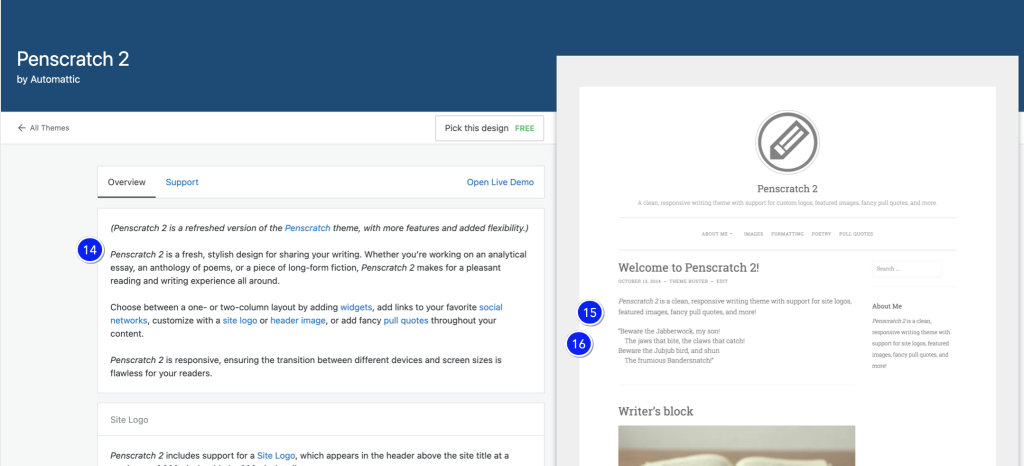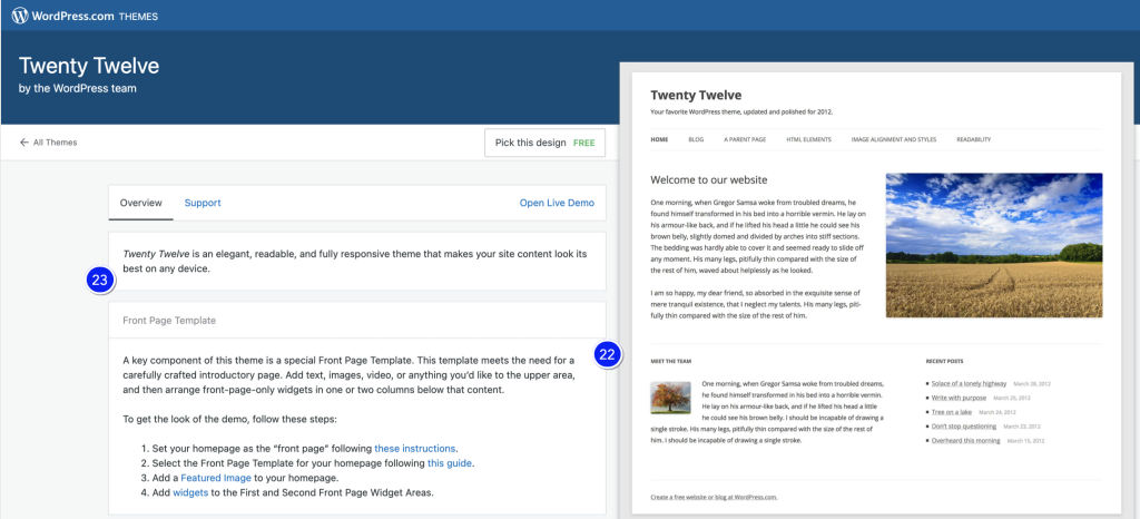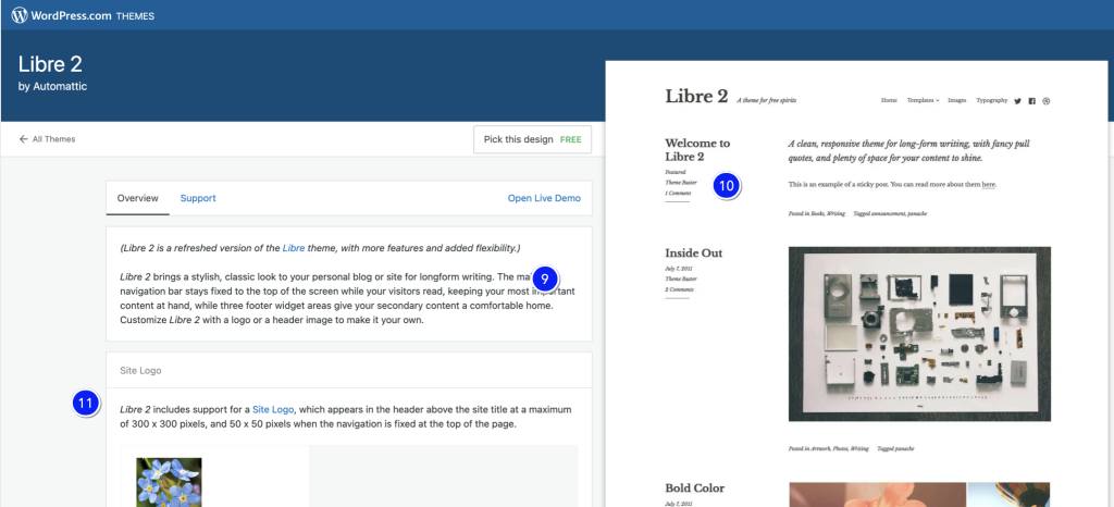In response to the Libre 2 template, I wrote: (9) I’m not sure that ‘longform’ describes the kind of content I’d share on my blog? Am I imagining more of a works-in-progress collection of project notes/updates, grad school reflections, etc. (10) I wonder who’s behind [the username] Theme Buster? Who does all this populating? (11) Attention to the logo and the subtitle of ‘A theme for free spirits’ gives this a freelancer vibe.