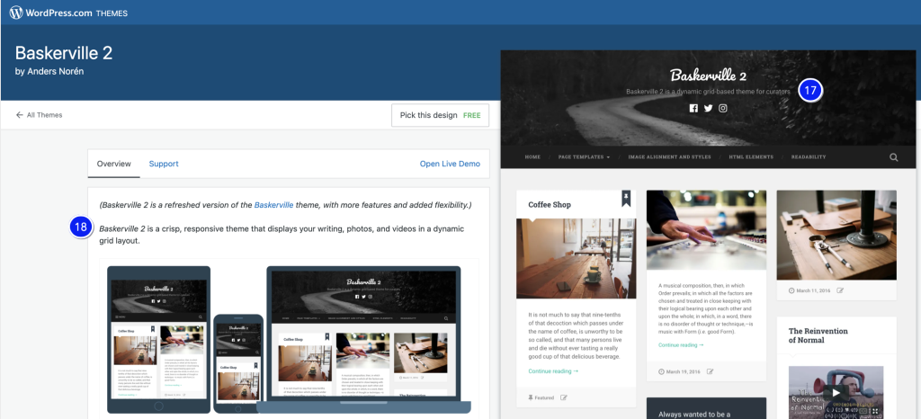 In response to the Baskerville 2 template, I wrote: (17) “For curators” … speaks to a need for organization but also for styling. Suited to a blog/site that needs to showcase a wide range of voices or projects–brought together by a central collector figure. (18) These adjectives are so weird: such a careful balancing act between appearing too rigid or too disorganized. Also: isn’t Baskerville a serif font?? (19) That balancing act carried over into the sample content, which brings together science and the arts; the ‘technique’ of piano, drafting, photography, brewing coffee..